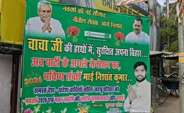 राजधानी पटना में जगह-जगह लगे इन पोस्टरों के जरिए निशांत कुमार से सीधे तौर पर राजनीति में आने की अपील की गई है। पोस्टर छात्र जदयू के प्रदेश उपाध्यक्ष कृष्णा पटेल की ओर से लगाए गए हैं, जिनमें नए साल और मकर संक्रांति की शुभकामनाओं के साथ एक राजनीतिक संदेश भी छिपा हुआ है। पोस्टर में लिखा गया है कि ‘चाचा जी के हाथों में सुरक्षित अपना बिहार, अब पार्टी के अगले जेनरेशन का भविष्य संवारें निशांत कुमार।’ यह पंक्तियां साफ तौर पर जदयू के भीतर नई पीढ़ी के नेतृत्व की मांग को दर्शाती हैं।