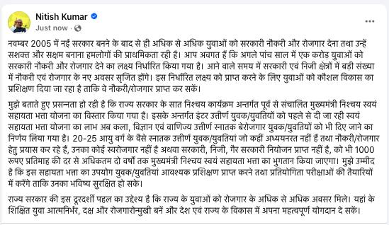 राज्य सरकार का कहना है कि आने वाले समय में सरकारी और निजी दोनों क्षेत्रों में रोजगार के अवसर बढ़ाए जाएंगे। साथ ही, कौशल विकास पर जोर देकर युवाओं को आधुनिक नौकरी बाजार के अनुरूप तैयार किया जाएगा।राज्य सरकार ने मुख्यमंत्री निश्चय स्वयं सहायता भत्ता योजना का विस्तार करने का निर्णय लिया है। पहले यह योजना केवल इंटर पास बेरोजगार युवाओं तक सीमित थी, लेकिन अब कला, विज्ञान और वाणिज्य से स्नातक उत्तीर्ण बेरोजगार युवक-युवतियों को भी इसका लाभ मिलेगा।