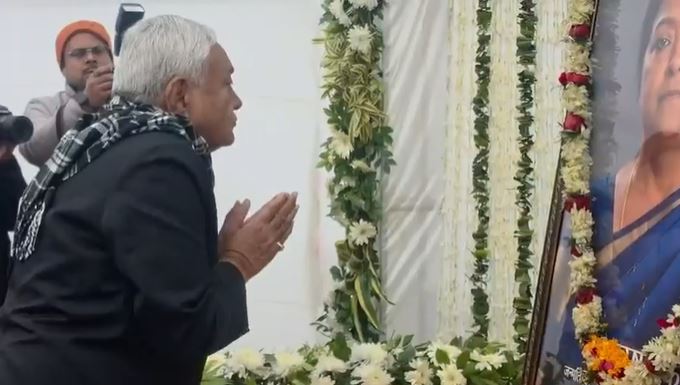 भोजपुर में मुख्यमंत्री नीतीश कुमार (Nitish Kumar Bhojpur) ने विधायक भगवान सिंह कुशवाहा की दिवंगत पत्नी उषा सिंह को श्रद्धांजलि दी। स्वर्गीय उषा सिंह, जगदीशपुर विधानसभा क्षेत्र के वर्तमान विधायक और बिहार सरकार के पूर्व मंत्री भगवान सिंह कुशवाहा की पत्नी थीं, जिनका बीते दिनों निधन हो गया था। कार्यक्रम स्थल पर पहुंचते ही मुख्यमंत्री नीतीश कुमार ने उषा सिंह के चित्र पर पुष्प अर्पित कर मौन साधा। कुछ देर बाद उन्होंने शोकाकुल परिवार से मुलाकात की और व्यक्तिगत तौर पर दुख साझा किया।