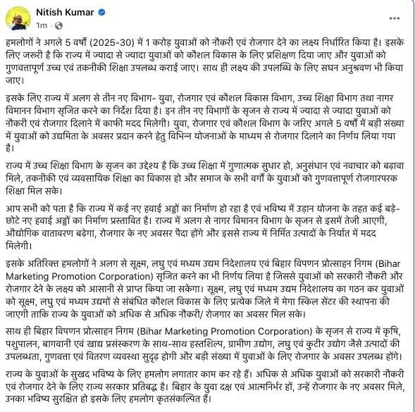बिहार सरकार ने राज्य के युवाओं को आत्मनिर्भर और सक्षम बनाने के लिए इतिहास का सबसे बड़ा रोजगार रोडमैप पेश किया है। मुख्यमंत्री नीतीश कुमार द्वारा घोषित इस महायोजना के तहत वर्ष 2025 से 2030 के बीच 1 करोड़ युवाओं को नौकरी और रोजगार उपलब्ध कराने का लक्ष्य निर्धारित किया गया है। यह लक्ष्य सिर्फ संख्या भर नहीं, बल्कि बिहार के आर्थिक ढांचे, शैक्षणिक गुणवत्ता और औद्योगिक माहौल में व्यापक परिवर्तन का संकेत देता है। मुख्यमंत्री ने एक्स पर पोस्ट करते हुए कहा कि राज्य के युवा तभी प्रगति करेंगे जब उन्हें उच्च स्तर की तकनीकी शिक्षा, कौशल विकास और गुणवत्तापूर्ण प्रशिक्षण का अवसर प्राप्त होगा। इसी दृष्टि से सरकार ने राज्य में कौशल विकास और रोज़गार सृजन के लिए गहन अनुश्रवण और मॉनिटरिंग की व्यवस्था भी सुनिश्चित की है।