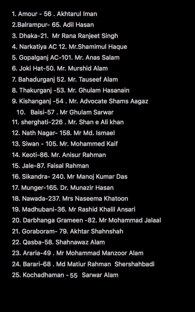 पार्टी मुख्य रूप से सीमांचल और मुस्लिम बहुल इलाकों में अपने राजनीतिक किले को मजबूत करना चाहती है। इस रणनीति से महागठबंधन और एनडीए दोनों ही प्रमुख राजनीतिक दलों की चुनावी योजनाओं पर असर पड़ने की संभावना है। ओवैसी की पार्टी ने जिन विधानसभा क्षेत्रों और उम्मीदवारों के नाम घोषित किए हैं, वे इस प्रकार हैं: