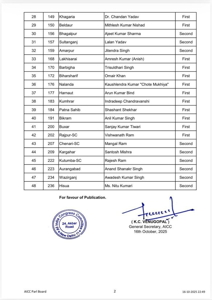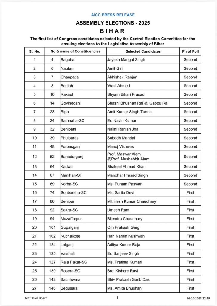 भारतीय राष्ट्रीय कांग्रेस ने 16 अक्टूबर 2025 को बिहार विधानसभा चुनाव 2025 के लिए अपनी पहली उम्मीदवार सूची जारी की, जिसमें कुल 48 नाम शामिल हैं। यह सूची मुख्य रूप से पहले दो चरणों के मतदान को ध्यान में रखकर तैयार की गई है—24 उम्मीदवार पहले चरण के लिए और 24 दूसरे चरण के लिए। महागठबंधन (कांग्रेस-राजद-वाम दलों) के तहत सीट बंटवारे की औपचारिक घोषणा से पहले ही यह लिस्ट जारी की गई है,