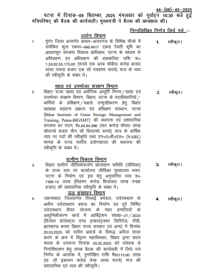 Tags: Anganwadi sevika manadeyAnganwadi sevika manadey BiharAnganwadi sevika manadey hikeBihar cabinet decision todayBihar Cabinet Meeting 2025Bihar development schemesBihar industrial expansionBihar industry expansionBihar LPG crematoriumBihar Solar Street Light projectBihar Solar Street Light SchemeBihar solar street light yojanaBihar Vivah Mandap constructionBihar vivah mandap schemeBihar Vivah Mandap YojanaMunger industrial areaNitish Kumar Bihar decisionsPatna Jeevika Bhawanआंगनबाड़ी सेविका वेतन वृद्धिनीतीश कुमार कैबिनेट फैसलानीतीश कुमार कैबिनेट फैसलेबिहार विकास योजनामुख्यमंत्री कन्या विवाह मंडप योजना