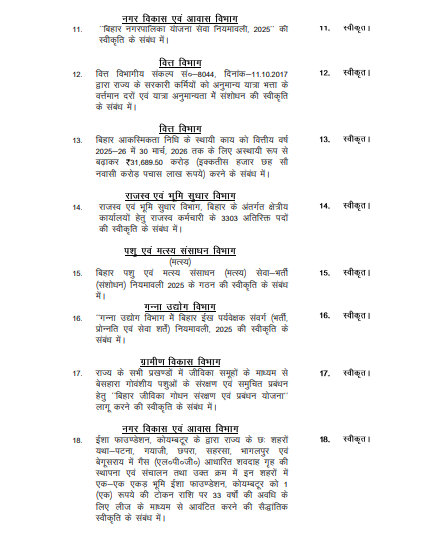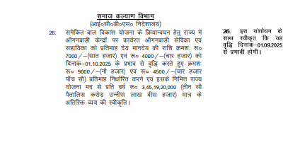 बैठक में सबसे बड़ा फैसला आंगनबाड़ी सेविकाओं और सहायिकाओं के मानदेय बढ़ाने का रहा। सेविकाओं का मानदेय 7000 रुपये से बढ़ाकर 9000 रुपये और सहायिकाओं का मानदेय 4000 रुपये से बढ़ाकर 4500 रुपये किया गया है। इसके लिए सरकार ने 345 करोड़ रुपये से अधिक की राशि मंजूर की है। नीतीश कुमार ने सोमवार को ही इस घोषणा का संकेत दिया था, जिसे अब कैबिनेट ने औपचारिक रूप दिया। इससे प्रदेश की लाखों आंगनबाड़ी सेविकाओं को प्रत्यक्ष लाभ मिलेगा।
