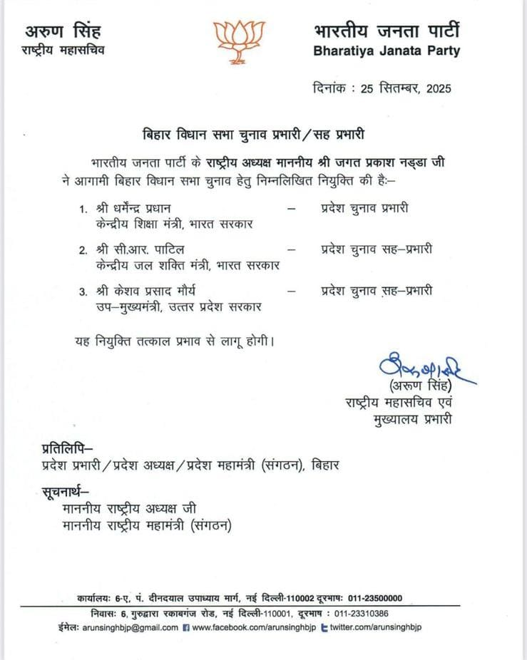 इसी बीच भारतीय जनता पार्टी ने भी चुनावी मोर्चे पर कमर कस ली है। पार्टी ने कई राज्यों के साथ-साथ बिहार के लिए भी अपने चुनाव प्रभारी और सह-प्रभारी की नियुक्ति कर दी है। केंद्रीय मंत्री धर्मेंद्र प्रधान को बिहार का चुनाव प्रभारी बनाया गया है। वहीं गुजरात के मुख्यमंत्री सी.आर. पाटिल और उत्तर प्रदेश के उपमुख्यमंत्री केशव प्रसाद मौर्य को बिहार का सह-प्रभारी नियुक्त किया गया है।