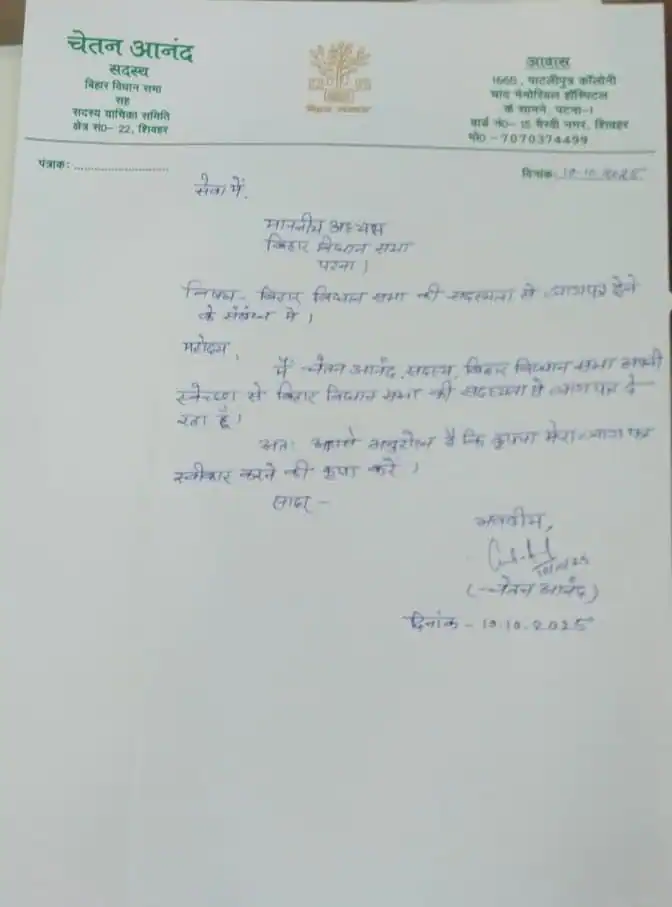चेतन आनंद ने अपना इस्तीफा विधानसभा अध्यक्ष को भेजा है। उन्होंने पत्र में किसी विशेष कारण का उल्लेख नहीं किया, बस यह लिखा कि उन्होंने “स्वेच्छा से इस्तीफा” दिया है। हालांकि, राजनीतिक गलियारों में यह चर्चा जोरों पर है कि चेतन आनंद अब जेडीयू (JDU) के टिकट पर शिवहर से चुनाव लड़ सकते हैं। सूत्रों के मुताबिक, नीतीश कुमार ने जिन 30 उम्मीदवारों की सूची पर हरी झंडी दी है, उसमें शिवहर से चेतन आनंद का नाम भी शामिल बताया जा रहा है।