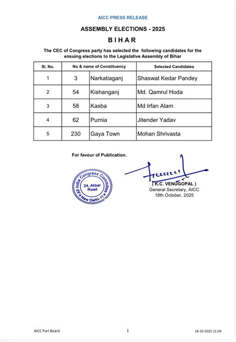 बिहार विधानसभा चुनाव 2025 को लेकर कांग्रेस ने शनिवार देर रात अपने उम्मीदवारों की दूसरी लिस्ट जारी कर दी। इस नई सूची में कुल 5 नाम शामिल हैं। इससे पहले कांग्रेस ने अपनी पहली लिस्ट में 48 प्रत्याशियों के नाम घोषित किए थे। यानी अब तक पार्टी ने कुल 53 सीटों पर अपने उम्मीदवार मैदान में उतार दिए हैं। कांग्रेस इस चुनाव में महागठबंधन के तहत राजद, वाम दलों और विकासशील इंसान पार्टी (वीआईपी) के साथ लड़ रही है, लेकिन सीट बंटवारे को लेकर स्थिति अब भी पूरी तरह स्पष्ट नहीं हो सकी है। इसके बावजूद कांग्रेस अपने संगठनात्मक संतुलन और जनाधार के हिसाब से मैदान तैयार कर रही है।