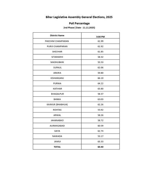 Bihar Election 2025 Live.. टूट रहा सब रिकॉर्ड.. 3 बजे तक 60.40 प्रतिशत मतदान, किशनगंज में सबसे अधिक