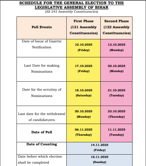 इस चरण में कई आरक्षित सीटें भी हैं — जिनमें सिंहेश्वर, सोनबरसा, बखरी, राजगीर, फुलवारी, मसौढ़ी और अगिआंव प्रमुख हैं। बिहार में इस बार चुनाव दो चरणों में संपन्न होगा। पहले चरण की वोटिंग 6 नवंबर 2025 को होगी जबकि दूसरे चरण का मतदान 11 नवंबर को निर्धारित है। चुनावी नतीजे 14 नवंबर 2025 को घोषित किए जाएंगे।