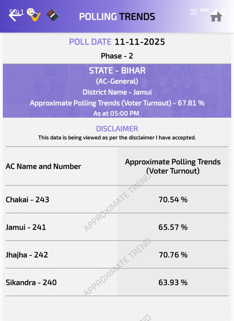 जमुई जिले के चारो विधानसभा छेत्रों मे शाम 5 बजे मतदान समाप्ति के बाद जमुई के जिलाधिकारी सह जिला निर्वाचन पदाधिकारी नवीन ने बताया की जमुई जिले के 242 झाझा विधानसभा छेत्र मे मतदान समाप्ति के उपरांत सर्वाधिक 70.76 प्रतिशत मतदान हुआ, जबकि चकाई 243 विधानसभा छेत्र मे 70.54, जमुई 241 मे 65.57 तथा 240 सिकंदरा मे 63.93 प्रतिशत मतदान हुआ। जमुई जिले के चारो विधानसभा छेत्रों को मिलाकर कुल 67.14 प्रतिशत मतदान हुआ।