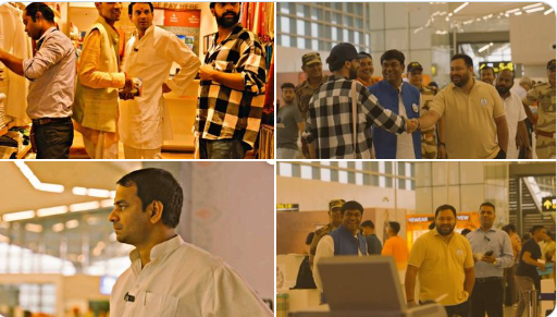 Tejpratap Yadav Tejashwi Yadav Patna Airport Silent Meet Lalu Yadav sons Bihar Election 2025 Tejashwi Yadav smiling at airport Tejpratap Yadav FabIndia store Bihar election Silent political moment Lalu family Patna Airport