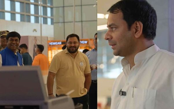 Tejpratap Yadav Tejashwi Yadav Patna Airport Silent Meet Lalu Yadav sons Bihar Election 2025 Tejashwi Yadav smiling at airport Tejpratap Yadav FabIndia store Bihar election Silent political moment Lalu family Patna Airport