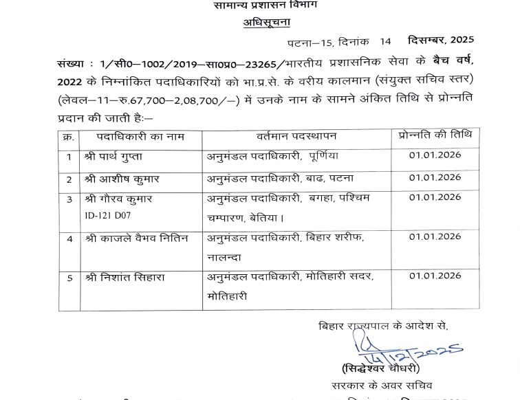 Bihar IAS Promotion: बिहार के प्रशासनिक गलियारों से नए साल की दस्तक से पहले एक अहम खबर सामने आई है। राज्य सरकार ने भारतीय प्रशासनिक सेवा के पांच युवा अधिकारियों को प्रमोशन का लाभ देकर स्पष्ट संकेत दिया है कि प्रशासनिक क्षमता और फील्ड परफॉर्मेंस को प्राथमिकता दी जा रही है। सामान्य प्रशासन विभाग की ओर से जारी अधिसूचना के साथ ही यह फैसला आधिकारिक रूप से लागू हो गया है, जो 1 जनवरी 2026 से प्रभावी माना जाएगा।