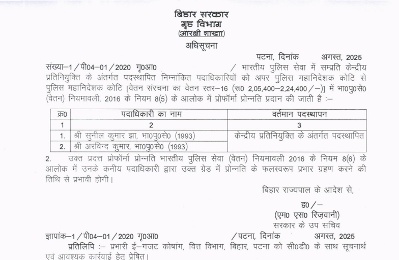 जानकारी के अनुसार, बिहार कैडर के 1993 बैच के दो वरिष्ठ आईपीएस अधिकारी सुनील कुमार झा और अरविंद कुमार को पुलिस महानिदेशक (DG Rank) में प्रमोट कर दिया गया है। प्रमोशन के साथ ही दोनों अधिकारियों को वेतन स्तर-16 में स्थान दिया गया है। फिलहाल दोनों अधिकारी केंद्रीय प्रतिनियुक्ति पर तैनात हैं, लेकिन उनके इस प्रमोशन को बिहार की प्रशासनिक व्यवस्था में एक बड़ा बदलाव माना जा रहा है।