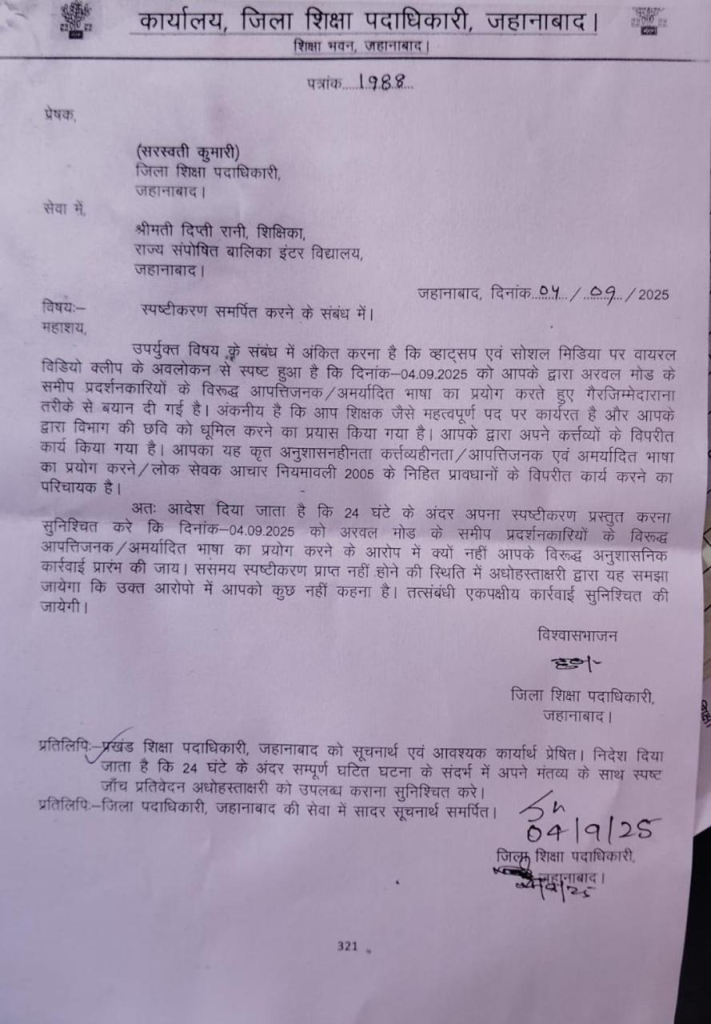 Jehenabad teacher Dipti Rani: पीएम नरेंद्र मोदी के खिलाफ हुई आपत्तिजनक टिप्पणी और बिहार बंद के दौरान हुई झड़प का मामला तूल पकड़ता जा रहा है। राज्य संपोषित बालिका इंटर विद्यालय की शिक्षिका दिप्ती रानी का वीडियो सोशल मीडिया पर वायरल होने के बाद शिक्षा विभाग ने उन पर कड़ी कार्रवाई की तैयारी शुरू कर दी है। जिला शिक्षा पदाधिकारी (डीईओ) सरस्वती कुमारी ने शिक्षिका को शो-कॉज नोटिस जारी करते हुए 24 घंटे के भीतर जवाब मांगा है।