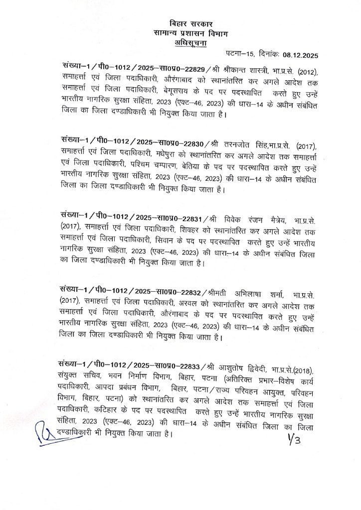 अरवल की DM अभिलाषा शर्मा को औरंगाबाद भेजा गया है, जबकि भवन निर्माण विभाग में संयुक्त सचिव आशुतोष द्विवेदी अब कटिहार जिला संभालेंगे। कटिहार में हाल के वर्षों में इंफ्रास्ट्रक्चर और बाढ़ प्रबंधन एक बड़ा मुद्दा रहा है, ऐसे में उनकी तैनाती को अहम माना जा रहा है।