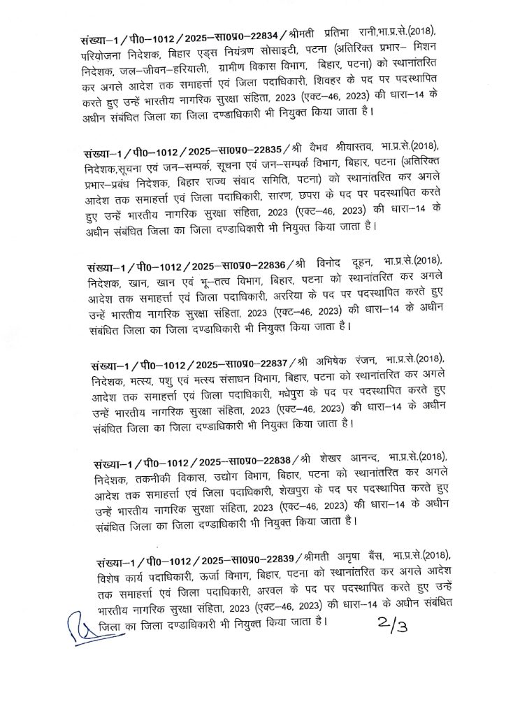प्रतिभा रानी अब शिवहर की नई जिलाधिकारी होंगी। सूचना एवं जनसंपर्क विभाग में निदेशक रहे वैभव श्रीवास्तव को सारण की कमान सौंपी गई है। खान निदेशक विनोद दुहन को अररिया भेजा गया है, जहां आपदा प्रबंधन से लेकर बॉर्डर सुरक्षा तक अनेक चुनौतियाँ मौजूद हैं। मत्स्य विभाग के निदेशक अभिषेक रंजन मधेपुरा के नए DM बने हैं।