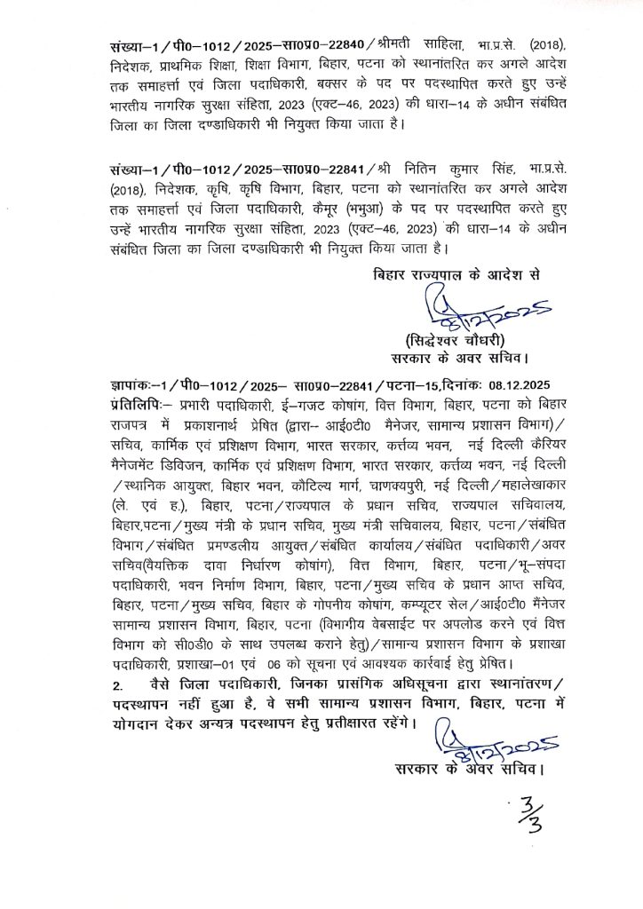 उद्योग विभाग में निदेशक शेखर आनंद अब शेखपुरा ज़िले को लीड करेंगे। ऊर्जा विभाग की विशेष कार्य पदाधिकारी अमृशा बैंस को अरवल का जिलाधिकारी बनाया गया है। प्राथमिक शिक्षा के निदेशक साहिला बक्सर की नई DM बनी हैं। कृषि विभाग के निदेशक नितिन कुमार सिंह को कैमूर का जिलाधिकारी नियुक्त किया गया है।