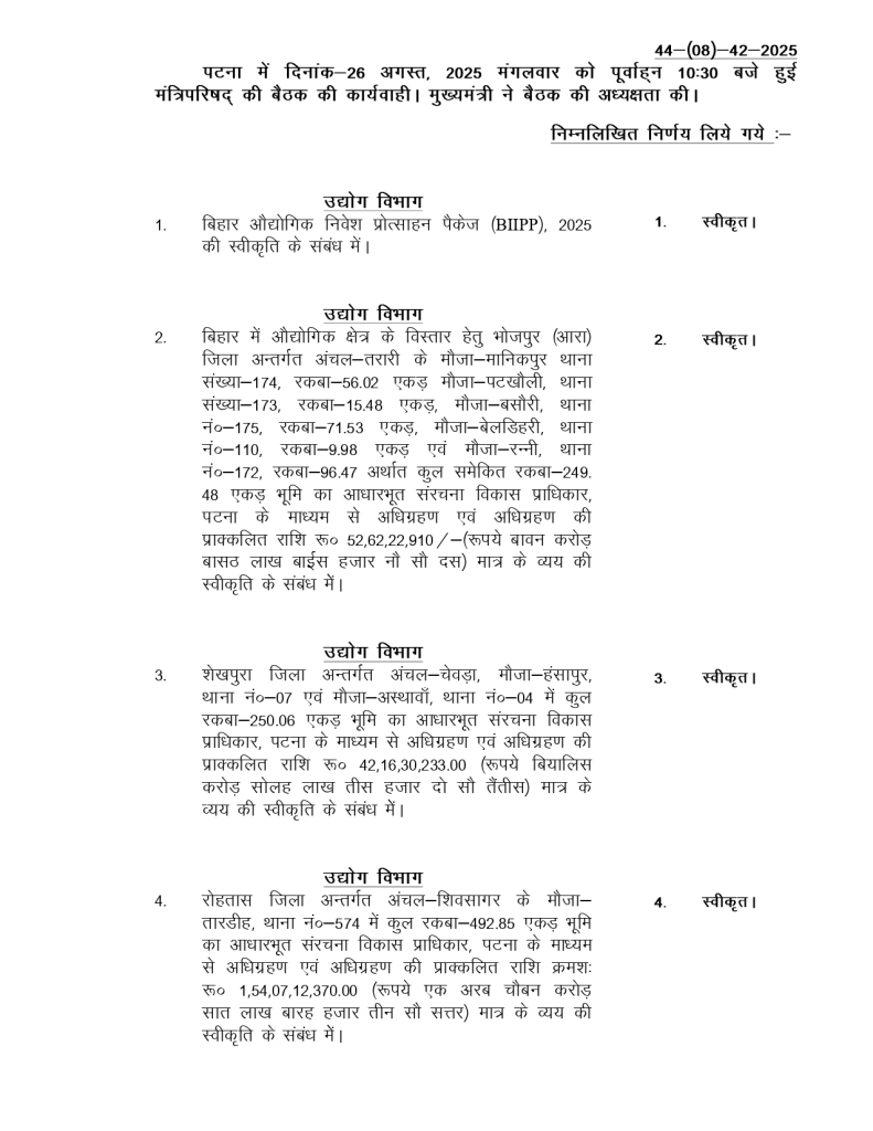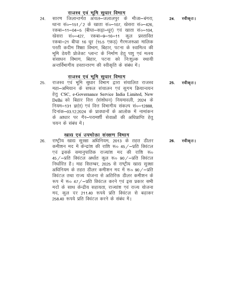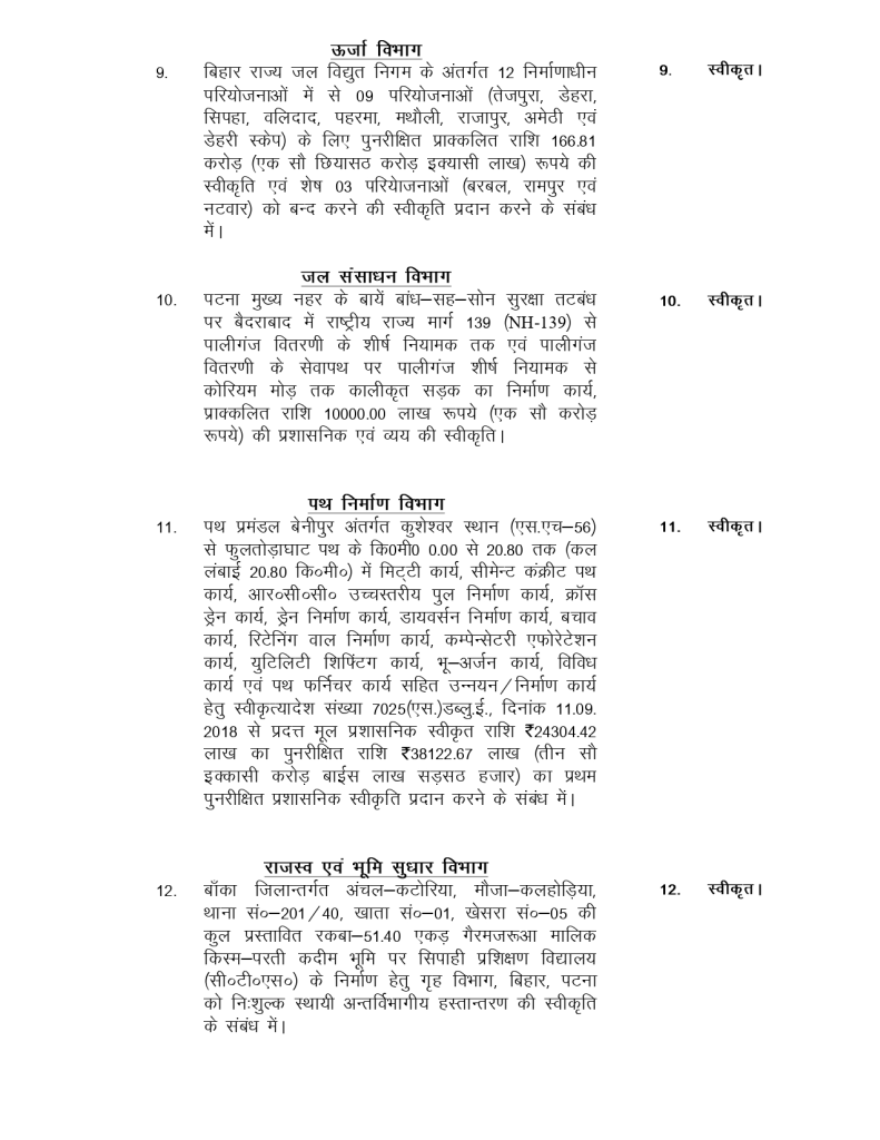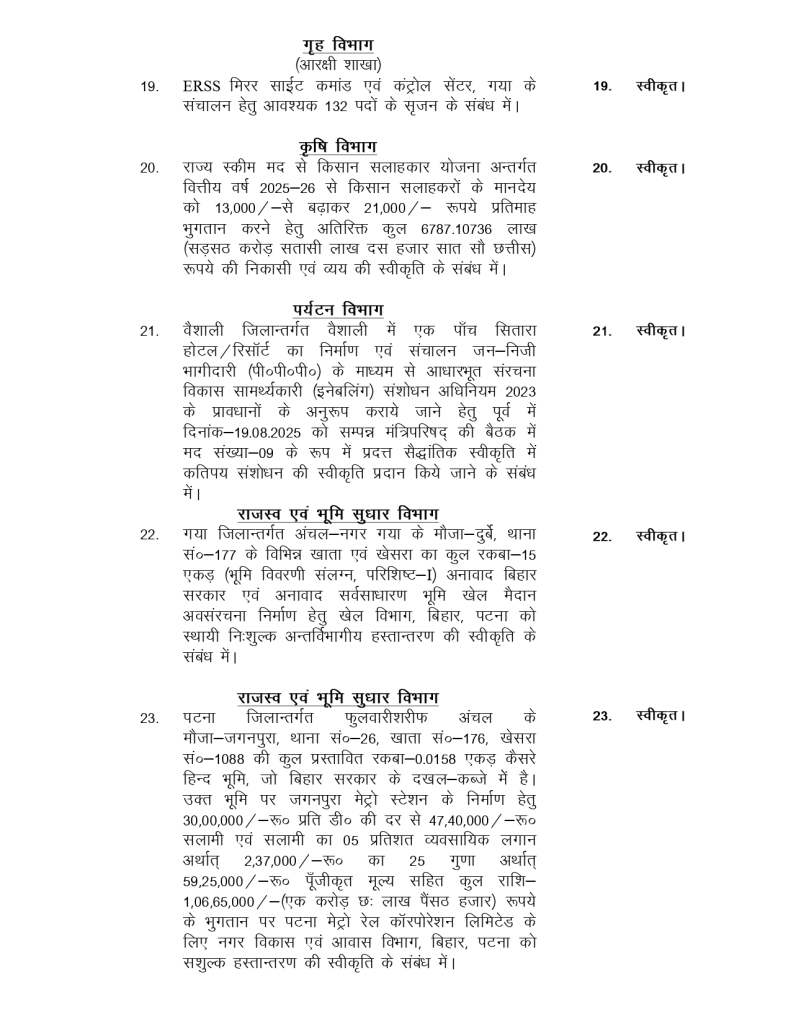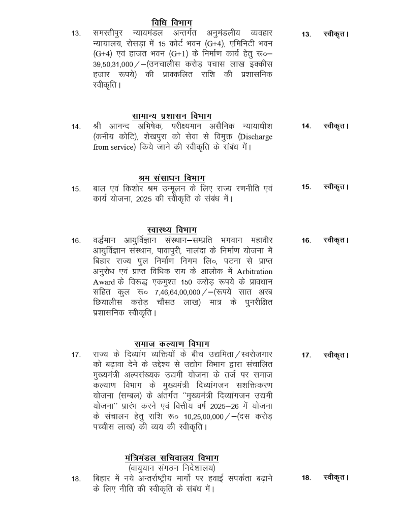 कैबिनेट की इस बैठक में शिक्षा, स्वास्थ्य, सड़क निर्माण, कृषि और सामाजिक कल्याण जैसे प्रमुख विभागों से जुड़े प्रस्तावों को हरी झंडी दी गई।