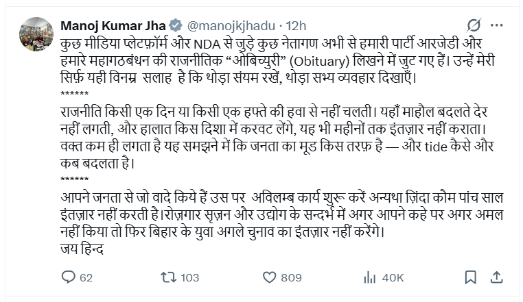 उन्होंने कहा कि सत्ता में बैठे लोगों को समझना चाहिए कि जनता की उम्मीदें लंबी अवधि तक धैर्य नहीं रखतीं। “ज़िंदा कौम पाँच साल इंतज़ार नहीं करती,” कहते हुए झा ने सत्तापक्ष को चेताया कि जनता की आकांक्षाओं को हल्के में लेना राजनीतिक भूल साबित हो सकती है।