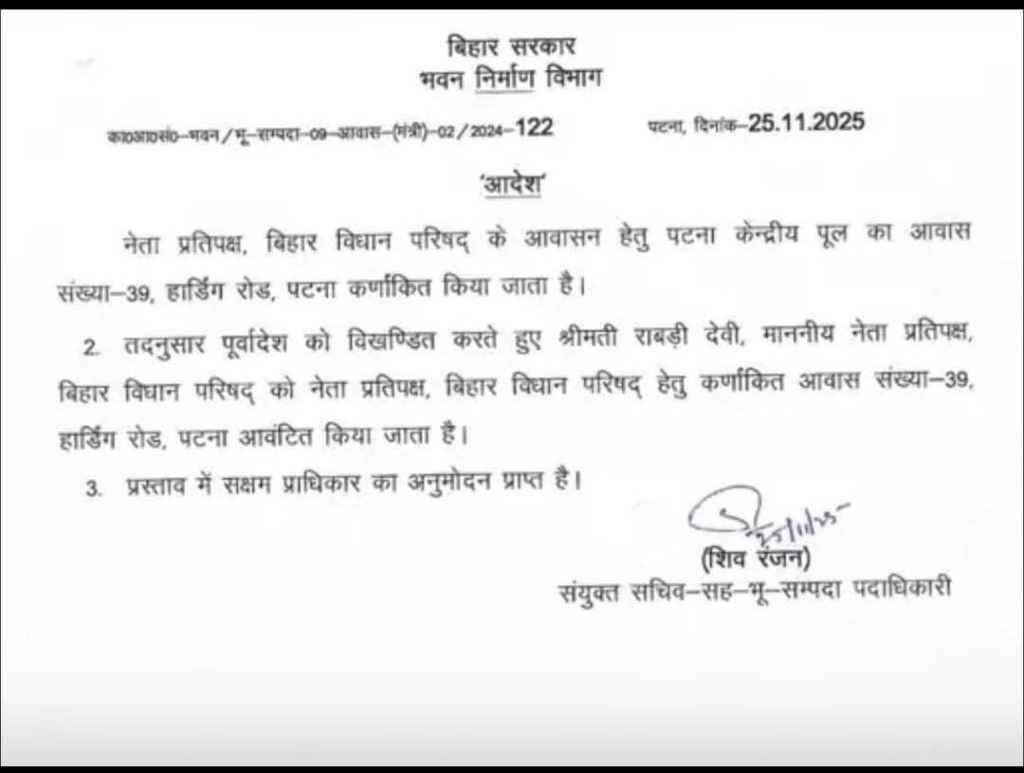 मंगलवार को भवन निर्माण विभाग ने मंत्रियों और विधान परिषद में नेता प्रतिपक्ष के लिए नए आवासों का आवंटन जारी किया। विभाग के संयुक्त सचिव-सह-भू-संपदा पदाधिकारी शिव रंजन की ओर से जारी पत्र में स्पष्ट लिखा गया कि राबड़ी देवी अब पूर्व मुख्यमंत्री के बजाय नेता प्रतिपक्ष पद पर हैं, इसलिए उन्हें नियमों के अनुसार नए सरकारी आवास में स्थानांतरित होना अनिवार्य है। सरकारी दस्तावेज में यह भी उल्लेख है कि पुराने आवास को खाली करने की प्रक्रिया औपचारिक रूप से जल्द शुरू की जाएगी।