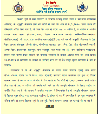 बिहार में भ्रष्टाचार के खिलाफ चल रहे अभियान के तहत विशेष निगरानी इकाई (SVU) ने बुधवार को सिवान की कार्यपालक अभियंता अनुभूति श्रीवास्तव के खिलाफ बड़ी कार्रवाई की। टीम ने एक साथ तीन ठिकानों पर छापेमारी की, जिनमें उनका पैतृक आवास लखनऊ (उत्तर प्रदेश) भी शामिल है। इस कार्रवाई ने न केवल स्थानीय प्रशासन बल्कि पूरे विभागीय तंत्र में हड़कंप मचा दिया है।