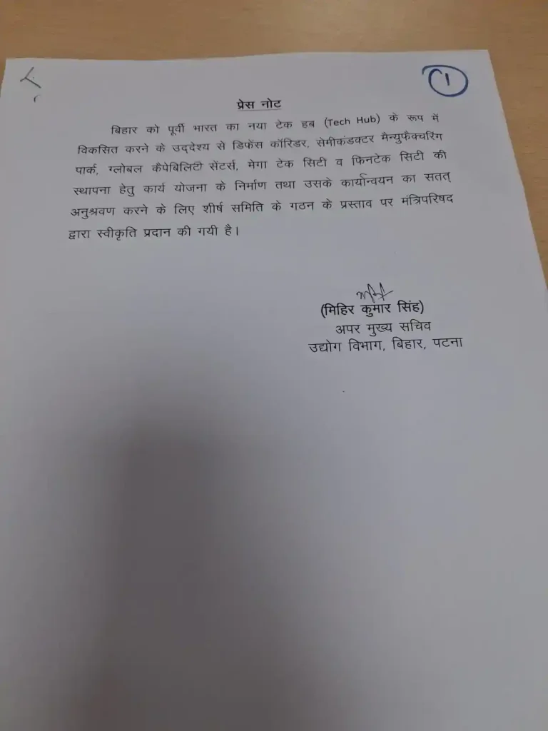 बिहार को पूर्वी भारत के सबसे बड़े टेक्नोलॉजी हब के रूप में विकसित करने का सबसे बड़ा फैसला इस बैठक में सामने आया। डिफेंस मैन्युफैक्चरिंग से लेकर सेमीकंडक्टर यूनिट्स और ग्लोबल कैपेबिलिटी सेंटर्स तक, सरकार की मंशा साफ है कि राज्य अब सिर्फ उद्योग की बात नहीं करेगा बल्कि हाई-टेक निवेशों के लिए आकर्षण का केंद्र बनेगा। इसके लिए फिनटेक सिटी, मेगा टेक सिटी और आईटी पार्क जैसी संरचनाएँ विकसित की जाएंगी।
