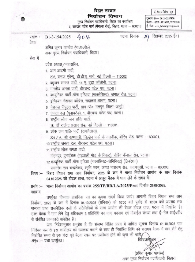 बिहार विधानसभा चुनाव (Bihar Chunav 2025) से पहले राज्य की सियासत में हलचल तेज हो गई है। 4 अक्टूबर को पटना में होने वाली चुनाव आयोग की बैठक ने एक नया राजनीतिक विवाद खड़ा कर दिया है। मुख्य निर्वाचन आयुक्त खुद राजधानी पहुंचकर सभी राजनीतिक दलों के साथ चुनाव तैयारियों की समीक्षा करेंगे। यह बैठक सुबह 10 बजे से दोपहर 12 बजे तक पटना के होटल ताज में होगी।
