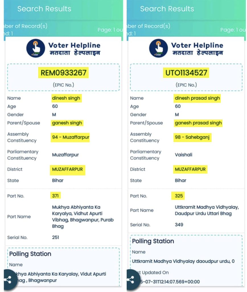 तेजस्वी यादव ने आरोप लगाया कि ड्राफ्ट वोटर लिस्ट में दोनों EPIC कार्ड सक्रिय हैं और दोनों क्षेत्रों में नाम मौजूद है। उन्होंने सवाल किया कि क्या मुख्यमंत्री के करीबी होने के कारण चुनाव आयोग ने इस तरह का उल्लंघन नजरअंदाज किया। उन्होंने यह भी जोड़ा कि दिनेश सिंह की पत्नी और वैशाली से सांसद वीणा देवी के पास भी दो EPIC ID और दो जगह वोट दर्ज हैं।