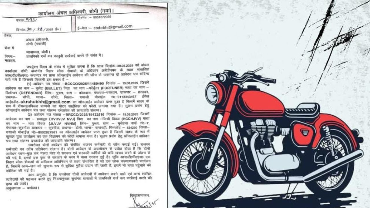 बिहार में प्रशासनिक अमले को हैरान कर देने वाला मामला सामने आया है। गया जिले के डोभी अंचल आरटीपीएस काउंटर पर जाति प्रमाण पत्र के लिए ऑनलाइन किए गए दो अनोखे आवेदन मिले, जिन्हें देखकर हर कोई दंग रह गया। पहले आवेदन में आवेदक का नाम ‘बुलेट’, पिता का नाम ‘फॉर्च्यूनर’ और माता का नाम ‘डिफेंडर’ लिखा गया था। इतना ही नहीं, साक्ष्य के रूप में रॉयल एनफील्ड बुलेट मोटरसाइकिल की तस्वीर तक अपलोड कर दी गई थी। आवेदन में गांव, पंचायत, थाना और मोबाइल नंबर तक दर्ज किए गए थे।