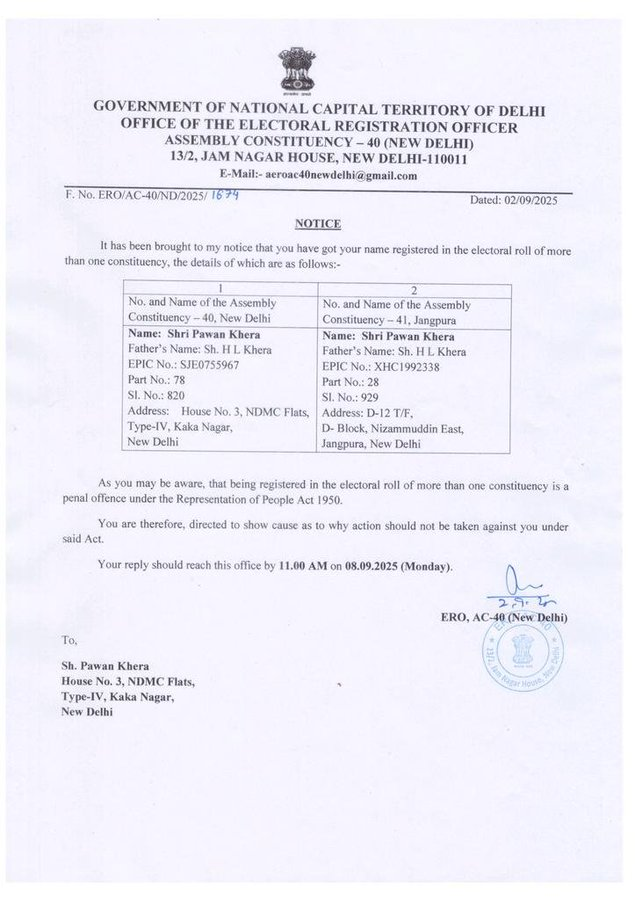 Pawan Khera voter list controversy Delhi कांग्रेस नेता पवन खेड़ा को निर्वाचन कार्यालय का नोटिस Electoral Roll multiple constituencies case Delhi election news Pawan Khera notice