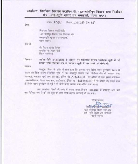बिहार के उपमुख्यमंत्री और बीजेपी नेता विजय कुमार सिन्हा को दो अलग-अलग विधानसभा क्षेत्रों में मतदाता के रूप में पंजीकरण और दो मतदाता पहचान पत्र रखने के आरोप में चुनाव आयोग ने नोटिस जारी किया है। अधिकारियों ने रविवार को इसकी पुष्टि की। बांकीपुर निर्वाचन क्षेत्र के रजिस्ट्रेशन अधिकारी ने उपमुख्यमंत्री को नोटिस जारी कर 14 अगस्त तक जवाब मांगा है। नोटिस में उनसे पूछा गया है कि वे दो विधानसभा क्षेत्रों में कैसे पंजीकृत हो सकते हैं और उनके पास दो मतदाता पहचान पत्र क्यों हैं।