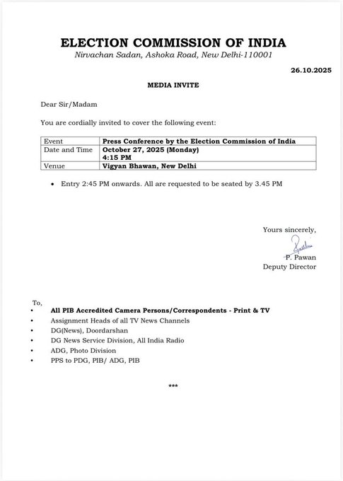 भारत चुनाव आयोग (Election Commission of India) अब एक बार फिर मतदाता सूची (Voter List) को लेकर बड़ा कदम उठाने जा रहा है। आयोग की ओर से शुक्रवार शाम 4:15 बजे दिल्ली के विज्ञान भवन में एक अहम प्रेस कॉन्फ्रेंस बुलाई गई है, जिसे मुख्य चुनाव आयुक्त (CEC) ज्ञानेश कुमार संबोधित करेंगे। आयोग के सूत्रों के मुताबिक, इस प्रेस कॉन्फ्रेंस में 10 से 15 राज्यों में विशेष गहन पुनरीक्षण (Special Intensive Revision – SIR) की घोषणा की जा सकती है। इन राज्यों में वे राज्य भी शामिल होंगे जहां अगले साल विधानसभा चुनाव होने वाले हैं, जैसे असम, केरल, तमिलनाडु, पश्चिम बंगाल और पुडुचेरी।