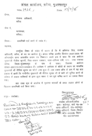 राजस्व कर्मचारी ने इसे जानबूझकर किया गया एक शरारतपूर्ण कृत्य बताया और कहा कि यह मुख्यमंत्री की छवि को नुकसान पहुँचाने और विभागीय प्रक्रिया को भ्रमित करने के उद्देश्य से किया गया है। उन्होंने पुलिस से अज्ञात आवेदक की पहचान कर उसके खिलाफ कड़ी कानूनी कार्रवाई की मांग की। इस गंभीर मामले में सरैया थाना में केस संख्या 387/25 दर्ज किया गया है। पुलिस ने इस मामले में भारतीय न्याय संहिता (BNS) की धारा 229, 233 और 356(1) के तहत प्राथमिकी दर्ज कर जांच शुरू कर दी है। फिलहाल आरोपी अज्ञात है, लेकिन पुलिस तकनीकी साक्ष्यों के आधार पर आवेदनकर्ता की पहचान में जुटी हुई है।