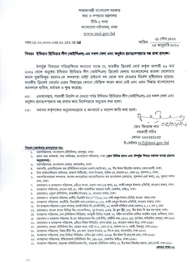 बांग्लादेश के सूचना और प्रसारण मंत्रालय ने प्रेस इंफॉर्मेशन डिपार्टमेंट के माध्यम से बयान जारी कर यह स्पष्ट कर दिया कि अगले आदेश तक आईपीएल 2026 से जुड़े सभी मैचों और कार्यक्रमों का टेलीकास्ट देश में बंद रहेगा। मंत्रालय की ओर से सभी ब्रॉडकास्टर्स को आधिकारिक पत्र जारी कर निर्देश दे दिए गए हैं। बांग्लादेश में आईपीएल की लोकप्रियता किसी से छिपी नहीं है और हर साल बड़ी संख्या में दर्शक इसे देखते हैं, ऐसे में यह फैसला दर्शकों और विज्ञापन उद्योग दोनों के लिए बड़ा झटका माना जा रहा है।