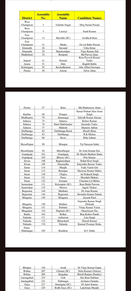 पश्चिम चंपारण जिले से डॉ. दृग नरायण प्रसाद (वाल्मीकि नगर) और सुनील कुमार (लौरिया) को टिकट दिया गया है, जबकि पूर्वी चंपारण की हरसिधि (SC) सीट से अवधेश राम मैदान में हैं। इसी तरह मधुबनी के बेनीपट्टी से मोहम्मद परवेज़ आलम, सुपौल के निर्मली से राम प्रवेश कुमार यादव, और अररिया की सिकटी सीट से राघिब बाबलू को उम्मीदवार बनाया गया है।