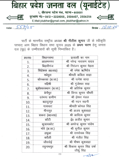 बिहार विधानसभा चुनाव (Bihar Election 2025) के लिए जनता दल यूनाइटेड (JDU) ने बुधवार को अपनी पहली सूची जारी कर दी है, जिसमें 57 उम्मीदवारों के नाम शामिल हैं। इस सूची के जारी होते ही राजनीतिक गलियारों में चर्चा तेज हो गई है, क्योंकि पार्टी ने जहां एक ओर तीन बाहुबली नेताओं को टिकट देकर ‘मसल पावर’ पर भरोसा जताया है, वहीं दूसरी ओर 10 अनुसूचित जाति (SC) उम्मीदवारों को उतारकर सामाजिक संतुलन साधने की कोशिश की है।
