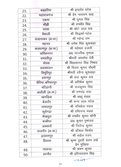 सूत्रों के अनुसार, सरायरंजन सीट पर मौजूदा मंत्री विजय कुमार चौधरी की जगह उनके बेटे के चुनाव लड़ने की अटकलें जोरों पर थीं, लेकिन पार्टी ने इन अटकलों पर विराम लगाते हुए एक बार फिर विजय चौधरी पर भरोसा जताया है। इसी तरह, 2020 के विधानसभा चुनाव में सबसे कम 12 वोटों से जीतने वाले कृष्ण मुरारी शरण उर्फ प्रेम मुखिया को भी पार्टी ने दोबारा हिलसा से मैदान में उतारा है।