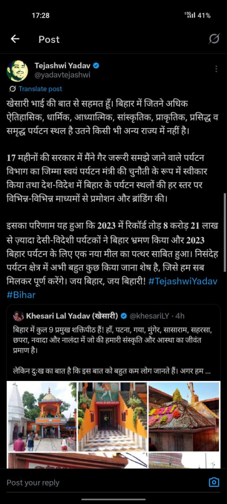 तेजस्वी ने कहा कि पर्यटन क्षेत्र में अभी भी काफी कुछ किया जाना बाकी है, और इसे आगे बढ़ाने के लिए सभी को मिलकर काम करना होगा। उन्होंने बिहारवासियों को संदेश देते हुए कहा, “बिहार की संभावनाएँ असीम हैं। हमें इन संभावनाओं को पहचान कर सही दिशा में आगे बढ़ाना होगा। जय बिहार, जय बिहारी!”