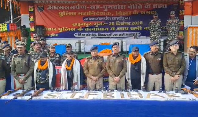 मुंगेर में नक्सलवाद की रीढ़ टूटी, तीन इनामी नक्सलियों का सशस्त्र आत्मसमर्पण.. विकास की राह पर खड़गपुर हिल्स