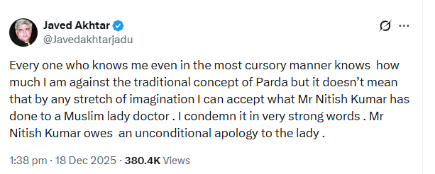 इस विवाद में अब मशहूर गीतकार और लेखक जावेद अख्तर भी खुलकर सामने आ गए हैं। उन्होंने सोशल मीडिया पर पोस्ट साझा करते हुए नीतीश कुमार से सार्वजनिक और बिना शर्त माफी की मांग की है। जावेद अख्तर का बयान इसलिए भी चर्चा में है क्योंकि वे खुद पर्दा प्रथा के पारंपरिक विचारों के आलोचक रहे हैं, लेकिन इसके बावजूद उन्होंने इस घटना को गलत और निंदनीय बताया है।