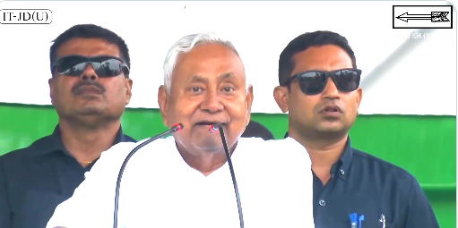 “राजगीर की सभा में संबोधन करते बिहार के मुख्यमंत्री नीतीश कुमार” “Nitish Kumar speaking at Rajgir election rally 2025” “नीतीश कुमार ने लालू परिवार पर साधा निशाना राजगीर रैली में”