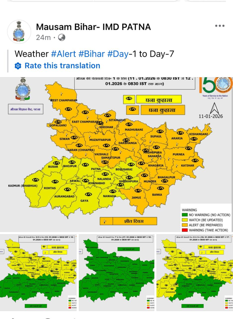 बिहार के मौसम को लेकर भारतीय मौसम विभाग ने गंभीर चेतावनी जारी की है। राज्य के 30 जिलों में घने कोहरे, विजिबिलिटी में कमी और शीतलहर की संभावना जताई गई है। विभाग के मुताबिक अगले 48 घंटे तक ठंड का असर और बढ़ सकता है तथा तापमान में 1 से 2 डिग्री सेल्सियस तक की गिरावट संभव है। राज्य में इस समय घना कोहरा और हड्डी जमा देने वाली ठंड ने लोगों की दिनचर्या बदल दी है। सबसे अधिक प्रभावित वे जिलों की सूची है जहां ऑरेंज और येलो अलर्ट लागू किया गया है।