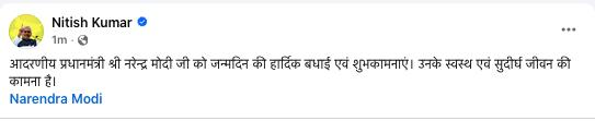 बिहार के मुख्यमंत्री नीतीश कुमार ने सोशल मीडिया पर प्रधानमंत्री को जन्मदिन की शुभकामनाएं देते हुए उनके दीर्घायु और स्वस्थ जीवन की कामना की। नीतीश ने लिखा—”आदरणीय प्रधानमंत्री श्री नरेंद्र मोदी जी को जन्मदिन की हार्दिक बधाई एवं शुभकामनाएं। उनके स्वस्थ एवं सुदीर्घ जीवन की कामना है।” इसी क्रम में केंद्रीय मंत्री जीतनराम मांझी ने भी पीएम मोदी की प्रशंसा करते हुए कहा कि उन्होंने ‘एक भारत-श्रेष्ठ भारत’, ‘आत्मनिर्भर भारत’ और ‘विकसित भारत’ का संकल्प लेकर देश को नई दिशा दी है। मांझी ने मोदी को गांव, गरीब, किसान और नौजवानों का सच्चा हितैषी बताया।