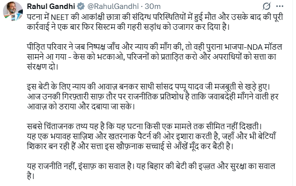 कांग्रेस नेता राहुल गांधी ने नीट छात्रा मौत (Rahul Gandhi on NEET) मामले और सांसद पप्पू यादव की गिरफ़्तारी पर बड़ा बयान दिया है। पुलिस कार्रवाई और सांसद पप्पू यादव की गिरफ्तारी को लेकर कांग्रेस नेता राहुल गांधी ने केंद्र और राज्य में सत्तारूढ़ भाजपा-एनडीए पर तीखा हमला बोला है। राहुल गांधी ने सोशल मीडिया के जरिए कहा कि यह सिर्फ एक घटना नहीं, बल्कि उस खतरनाक व्यवस्था की तस्वीर है, जिसमें पीड़ितों की आवाज को दबाया जाता है और जवाबदेही मांगने वालों को निशाना बनाया जाता है। उनका आरोप है कि निष्पक्ष जांच की मांग करने पर वही पुराना सत्ता-तंत्र सक्रिय हो जाता है, जो केस को भटकाने, परिवार को प्रताड़ित करने और आरोपियों को संरक्षण देने का काम करता है।