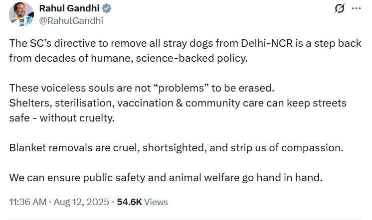 दिल्ली-एनसीआर में आवारा कुत्तों पर सुप्रीम कोर्ट सख्त है। अदालत ने आदेश दिया है कि कुत्तों को शेल्टर होम भेजा जाए। सड़क पर कुत्ते नजर नहीं आने चाहिए। वहीं अगर कोई पशु प्रेमी इस फैसले के बीच में आया तो उस पर भी कार्रवाई की जाएगी। अदालत के फैसले के बाद कांग्रेस सांसद राहुल गांधी ने आवारा कुत्तों पर सुप्रीम कोर्ट के फैसले पर प्रतिक्रिया दी है। उन्होंने एक्स पर लिखा है।