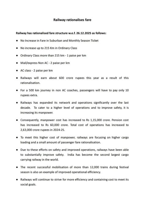 रेलवे के मुताबिक, यह बदलाव पूरी तरह “डिफरेंशिएटेड अप्रोच” पर आधारित है, जिसमें छोटी और लंबी दूरी के यात्रियों के बीच संतुलन बनाया गया है। रोज ऑफिस, पढ़ाई या छोटे कामों के लिए ट्रेन से सफर करने वालों पर कोई अतिरिक्त आर्थिक बोझ नहीं डाला गया है। रेलवे का मानना है कि ऑर्डिनरी क्लास में 215 किलोमीटर तक किराया न बढ़ाने से रोजाना सफर करने वाले लाखों यात्रियों को सीधा फायदा मिलेगा और यह फैसला सामाजिक रूप से भी संतुलित है।