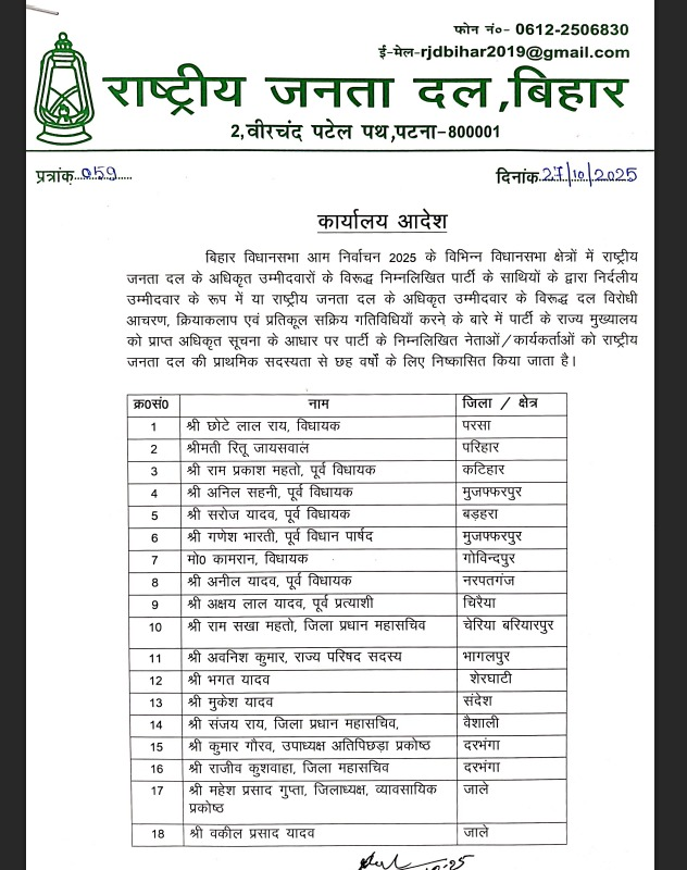 सबसे बड़ा नाम इस निष्कासन सूची में आया है परसा से मौजूदा विधायक छोटे लाल राय का। छोटे लाल राय राजद के पुराने और प्रभावशाली नेता माने जाते हैं। उनके अलावा कटिहार के पूर्व विधायक राम प्रकाश महतो, मुजफ्फरपुर के पूर्व विधायक अनिल सहनी, बड़हरा के सरोज यादव, मुजफ्फरपुर के पूर्व विधान पार्षद गणेश भारती और परिहार की पूर्व मुखिया रितू जायसवाल को भी पार्टी से बाहर का रास्ता दिखा दिया गया है।