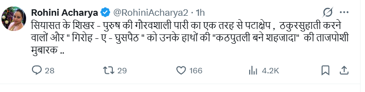 हालांकि इस फैसले ने पार्टी के भीतर ही एक असहज बहस को जन्म दे दिया है। तेजस्वी यादव की बहन रोहिणी आचार्य ने सोशल मीडिया प्लेटफॉर्म एक्स पर तीखी प्रतिक्रिया देते हुए इस ताजपोशी पर सवाल खड़े कर दिए। उन्होंने अपने पोस्ट में इसे “सियासत के शिखर-पुरुष की गौरवशाली पारी का एक तरह से पटाक्षेप” बताते हुए इशारों में पार्टी के मौजूदा नेतृत्व तंत्र पर हमला किया। उनके शब्दों में ठकुरसुहाती करने वालों और “गिरोह-ए-घुसपैठ” के हाथों कथित रूप से एक “कठपुतली बने शहजादा” की ताजपोशी का जिक्र, RJD के अंदर चल रही खींचतान को सार्वजनिक मंच पर ले आया।