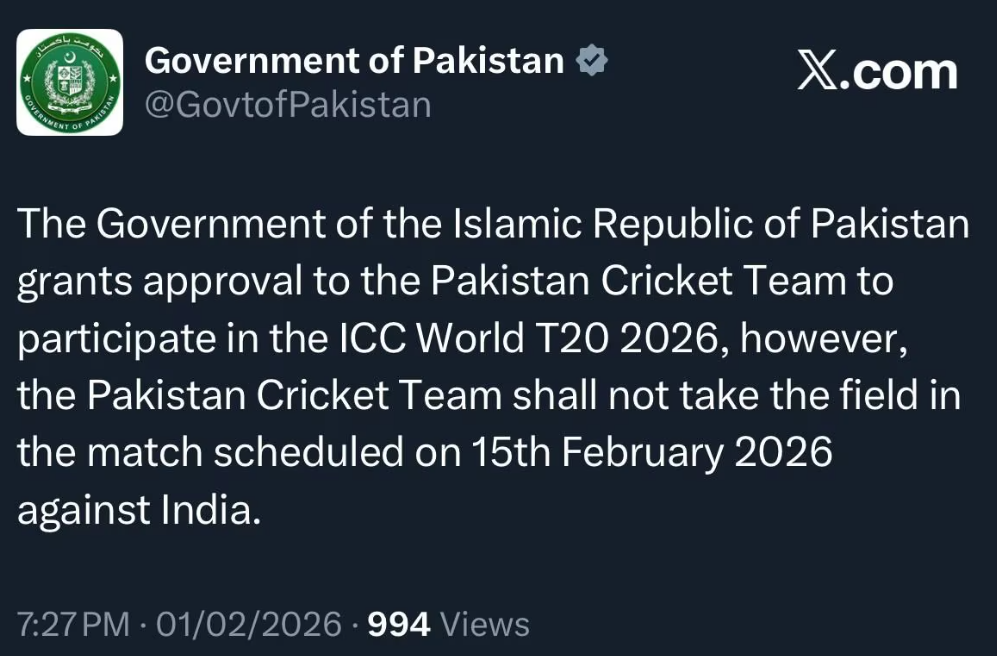 रविवार को सोशल मीडिया प्लेटफॉर्म एक्स पर पाकिस्तान सरकार की ओर से जारी आधिकारिक बयान में कहा गया कि इस्लामिक रिपब्लिक ऑफ पाकिस्तान की सरकार राष्ट्रीय टीम को आईसीसी टी20 वर्ल्ड कप 2026 में भाग लेने की अनुमति देती है, लेकिन भारत के खिलाफ निर्धारित मैच में टीम मैदान में नहीं उतरेगी। सरकार के इस बयान ने साफ कर दिया कि फैसला खेल प्रशासन का नहीं, बल्कि राजनीतिक स्तर पर लिया गया है।